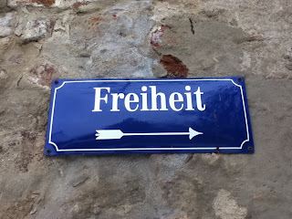 An American friend who lives in what used to be Eastern Germany brought the picture. He said it represents a common theme in his life the previous few months. I asked him for a copy because translated into English, this sign says... Freedom.